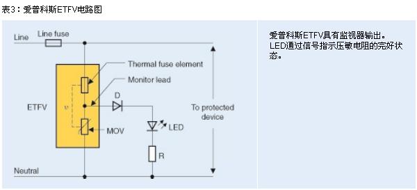 为使太阳能逆变器制造商以低成本满足各大标准及保险公司的严格要求,TDK-EPC现开发出 ETFV系列(爱普科斯热熔式压敏电阻)。这些组件通过串联电路组合在一起,包括一个压敏电阻和一个热熔丝。如果压敏电阻已严重退化,并致使较高漏电流导致过热,熔丝将熔断以断开压敏电阻。上述元件的一大特色便是监视引线:通过延伸压敏电阻与热熔丝之间的触点以驱动LED(参见图3)。