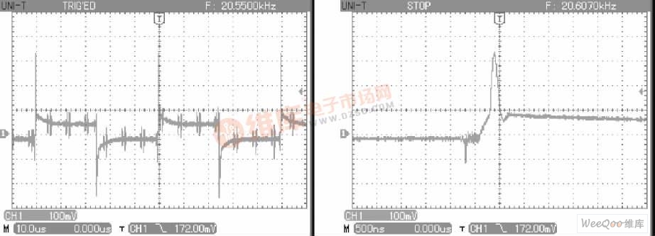 另外,开通过程中,由于二极管D1的反向恢复电流IRM将叠加在集电极电流iC上,这也会使IGBT实际流过的电流存在一个尖峰,这一尖峰可通过串联在回路中的电阻上的电压波形观察。