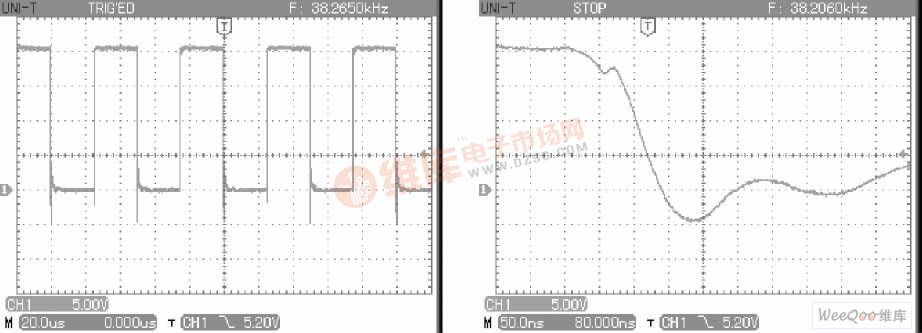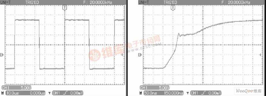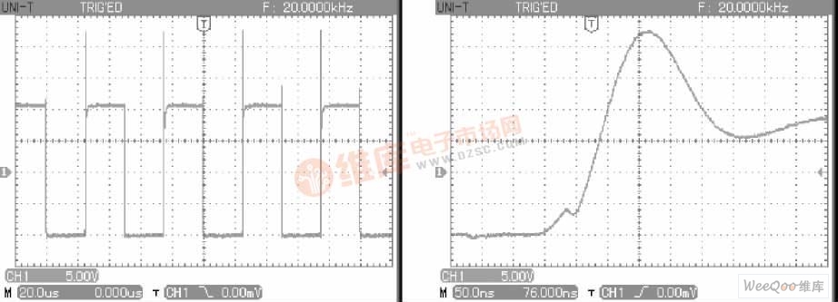 在输入端增大串联电阻R1的阻值, 会使输入驱动波形的上升沿与下降沿(GE端电压) 的锐度减缓, 其影响是使IGBT的开通与关断的时间延长, 同时输出端(CE) 的上升沿与下降沿的锐度也同样减缓, 并可减小输出端CE两端电压的尖峰, 另外, 带给电源的高频谐波的峰值也在减小。但是, 这样会使IGBT的开关损耗增大。