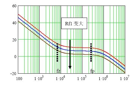 因此,当补偿网络进入系统环路之后,Rf1的作用是使环路增益的幅频特性上下平移,同时环路增益的相频特性保持不变。