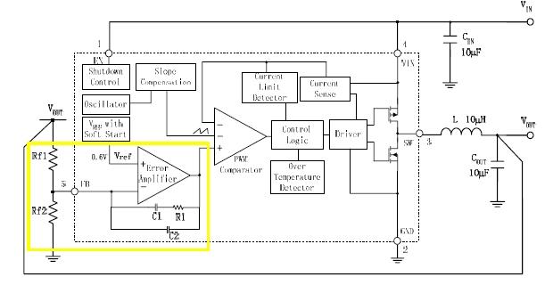 反馈电阻Rf1和Rf2的第一个作用是设置Buck电路的输出电压值,如图2所示,稳态时,运算放大器的反相输入端和同相输入端电压是相等的,于是可以得到输出电压计算公式: