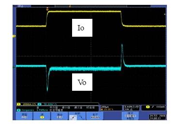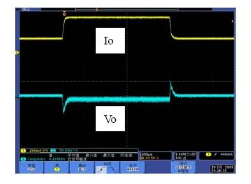 系统的带宽是影响系统动态响应的重要因素,相位裕度是影响系统稳定性的重要因素。如果选择不同的Rf1,系统的带宽和相位裕度会产生变化,也就是动态响应和稳定性会发生变化。具体以表1来分析,当Rf1从300k变到750k,系统地带宽从51.1kHz变到26.1kHz,因此系统的动态响应会相应的变差,而由于相位裕度都是足够的,因此系统都处于稳定工作的状态。图7和图8是做负载切换的动态响应测试结果,从测试结果可以看出环路响应速度变慢,导致输出电压过冲变大,动态响应效果变差。