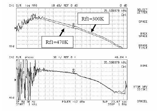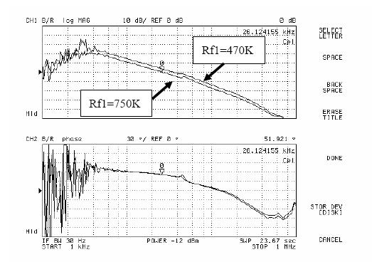 图5和图6是用网络分析仪进行AP3406环路增益测试的结果。由图可以看出,当Rf1从300k变化到470k,再变化到750k,系统的环路增益的幅频特性不断向下移动,同时相频特性基本不变。于是系统的带宽和相位裕度都有较大改变,测试结果如表1所示。