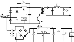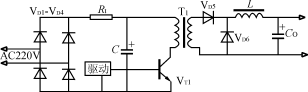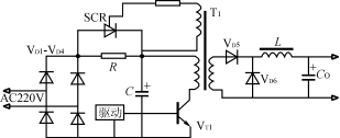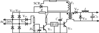 该电路如图3所示。在电源瞬时接通时,输入电压经整流桥VD1VD4和限流电阻R对电容器C充电。当电容器C充电到约80%的额定电压时,逆变器正常工作,经主变压器辅助绕组产生晶闸管的触发信号,使晶闸管导通并短路限流电阻R,开关电源处于正常运行状态。