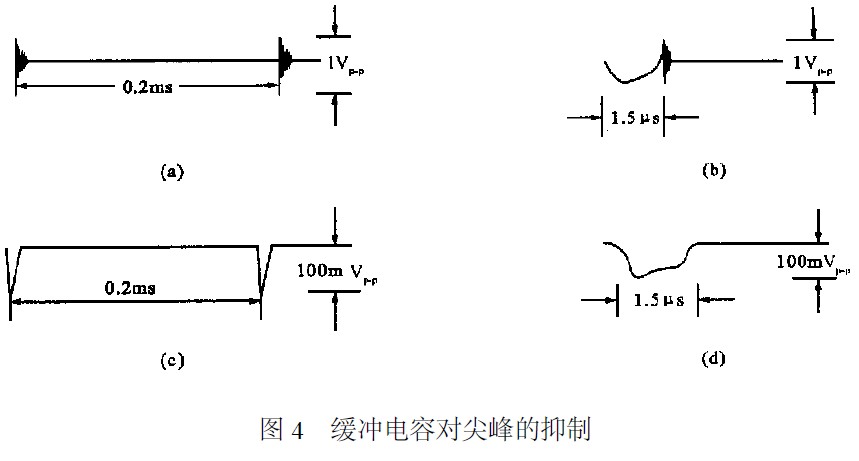 在开关三极管的CE之间,或者在续流二极管的两端并联RC缓冲电路可使尖峰干扰明显减小。图3中,三极管T关断时,集电极电压上升,通过D和R1对C充电,使其上升速率变缓,选择充电常数CR1的值可以控制上升速率。T导通时,D截止,C对R1和R2放电,限制了导通瞬间的峰值电流。该缓冲电路改变了负载线的形状,减少了开关三极管的损耗。在续流二极管两端并上RC电路也同样有效。图3中,当用3DD11和2CK120C时,可并0.022LF左右的电容器(f=2kHz),该电容的容量有一最佳值,它的作用可以从图4看出。图4(a)是不加C的情况,将其在时间轴上放大后为图4(b)。并上缓冲电容后分别见图4(c)和(d)。