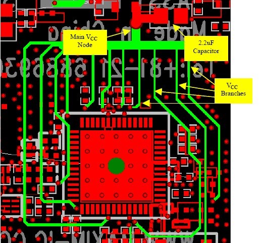 设计RF电路时,电源电路的设计和电路板布局常常被留到高频信号通路的设计完成之后。对于没有经过深思熟虑的设计,电路周围的电源电压很容易产生错误的输出和噪声,从而对RF电路的系统性能产生负面影响。合理分配PCB的板层、采用星形拓扑的VCC引线,并在VCC引脚加上适当的去耦电容,将有助于改善系统的性能,获得最佳指标。合理的PCB层分配便于简化后续的布线处理,对于一个四层PCB(WLAN中常用的电路板),在大多数应用中用电路板的顶层放置元器件和RF引线,第二层作为系统地,电源部分放置在第三层,任何信号线都可以分布在第四层。第二层采用不受干扰的地平面布局对于建立阻抗受控的RF信号通路非常必要,还便于获得尽可能短的地环路,为第一层和第三层提供高度的电气隔离,使得两层之间的耦合最小。当然,也可以采用其它板层定义的方式(特别是在电路板具有不同的层数时),但上述结构是经过验证的一个成功范例。大面积的电源层能够使VCC布线变得轻松,但是,这种结构常常是导致系统性能恶化的导火索,在一个较大平面上把所有电源引线接在一起将无法避免引脚之间的噪声传输。反之,如果使用星形拓扑则会减轻不同电源引脚之间的耦合。图1给出了星形连接的VCC布线方案,该图取自MAX2826IEEE802.11a/g收发器的评估板。图中建立了一个主VCC节点,从该点引出不同分支的电源线,为RFIC的电源引脚供电。每个电源引脚使用独立的引线,为引脚之间提供了空间上的隔离,有利于减小它们之间的耦合。另外,每条引线还具有一定的寄生电感,这恰好是我们所希望的,它有助于滤除电源线上的高频噪声。