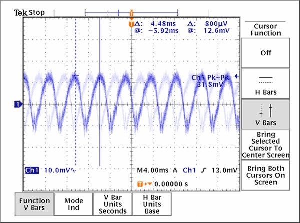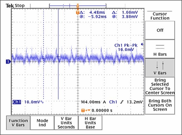 [page]经验证明,抑制PLL杂散的有效途径是合理的接地、电源布局和去耦技术,本文讨论的布线原则是减小PLL杂散分量的良好设计开端??悸堑降绾杀弥写嬖诮洗蟮牡缌鞅浠?,采用星形拓扑非常必要。如果没有足够的隔离,电流脉冲产生的噪声会耦合到VCO电源,对VCO频率进行调制,通常称为“VCO牵引”。通过电源线间的物理间隔和每个VCC引脚的去耦电容、合理放置接地过孔、引入一个串联的铁氧体元件(作为最后一个手段)等措施可以提高隔离度。上述措施并不需要全部用在每个设计中,适当采用每种方式都会有效降低杂散幅度。图9提供了一个由于不合理的VCO电源去耦方案所产生的结果,电源纹波表明正是电荷泵的开关效应导致电源线上的强干扰。值得庆幸的是,这种强干扰可以通过增加旁路电容得到有效抑制。图10显示的是在电路改变后,在同一点的测量结果。