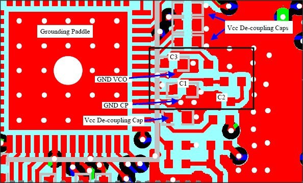 图6.MAX2827参考设计板上PLL滤波器元件布置和接地示例