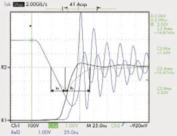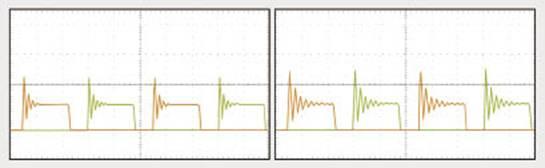 把有害电压尖刺降至最小的一般原则是采用短而厚的电路板以及最小的电流回路。然而,由于尺寸和成本的限制,做到这些并不容易。有时,设计人员必需考虑到机械结构的问题,如散热器和风扇;有时鉴于成本限制因素,不得不使用单面印制电路板。缓冲电路可作为一种可行的替代方案,用来在最大额定漏源电压范围内管理电压尖刺。这种情况下,额外的功耗是无法避免的。此外,轻载下缓冲电路本身产生的功耗也不可忽视。除了电路板参数之外,器件的特性也对电压尖刺电平有影响。在同步整流中,一个主要的器件相关参数是反向恢复期间的体二极管软度因子(softness)?;旧?,二极管的反向恢复特性是由设计决定的。有好几个控制输入对反向恢复产生影响,如结温、di/dt和正向电流水平。但是,当条件固定时,二极管总是表现出相同的行为。因此,器件的评估结果对评测系统的运作情况非常有用。图10所示为两个不同器件(但有极其相似的额定值)的反向恢复波形。