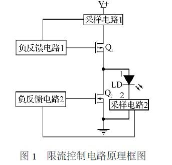 Q1为P型MOS管,Q2为N型MOS管。流过Q1的电流通过采样电路1变为电压信号与基准电压相比较,通过负反馈电路1控制,可使得流过Q1的电流恒定。通过半导体激光器LD的电流经过采样电路2变为电压信号与电流调节端电压相比较,如果流过半导体激光器的电流超过设定值,经过负反馈电路2调节使得通过Q2的电流增加,导致通过LD电流减??;流过LD的电流太小,经过采样电路2、负反馈电路2调节可使得流过Q2的电流变小,导致流过LD的电流变大,如此反复,通过负反馈电路的控制可使得流过半导体激光器的电流恒定,这种负反馈过程建立的时间很快。