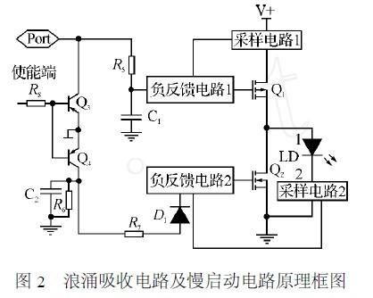 调节R5、C1和R6、C2参数可以使得t2mt1。这样在t1阶段,通过负反馈电路1的控制使得Q1慢慢导通,流过Q1电流从零直到恒定,这时由于t2mt1,C2上还有电压,通过负反馈电路2的控制使得Q2处于导通状态,这样流过Q1的电流,以及由于Q1开通产生的浪涌电流全部由Q2吸收,然后随着时间的增加C2电压慢慢降为零,流过Q2的电流慢慢减小,LD上电流慢慢增加直到达到设定值。