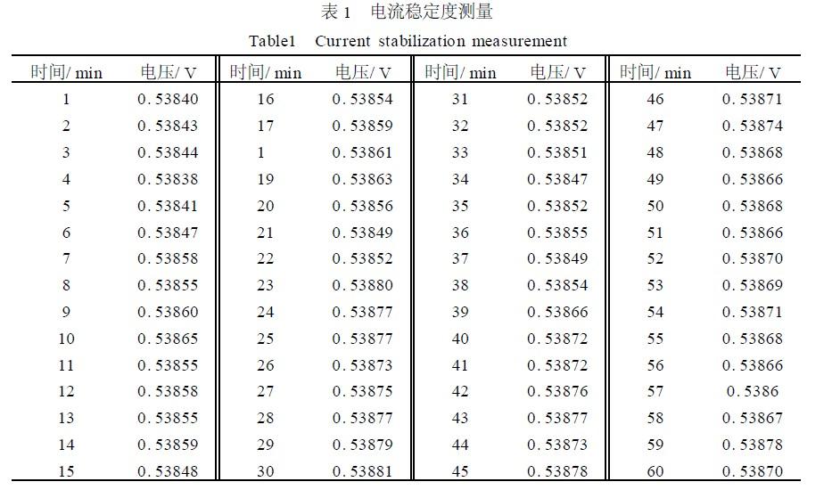 驱动电源一个重要技术参数为电流稳定度。电流稳定度是在一定时间内,多次测量通过负载的电流大小,然后通过数学计算得出输出电流稳定度大小。实验中每间隔一分钟测量一次,测量时间持续一个小时。测量时,用1.2Ω50W电阻作为模拟负载,测量模拟负载的两端电压,用模拟负载两端电压稳定性来标定电流稳定性。测量仪器为:电压测量仪器:Agilent34401A61/2digitmultime2ter,其精度可以达到0.00001V;供电电源为Agi2lentE3631AtripleoutputDCpowersupply12V,1A。电流稳定度实验数据如表1所示。