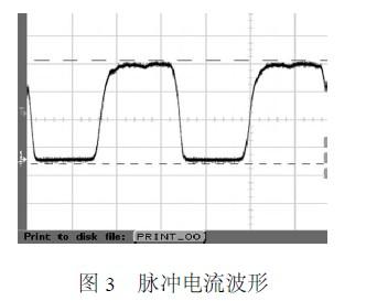 此?;さ缏芬丫τ糜谑导?,由于限流措施稳定可靠,半导体激光器的使用寿命得到了保证。利用功率器件的开通与关断强制吸收和隔离浪涌冲击,使得在脉冲工作状态下的浪涌冲击也被很好地抑制,图3是电源工作在脉冲状态下,负载实际的电压波形。