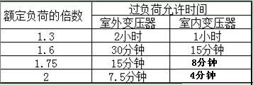 过负荷运行是指变压器运行时超过了铭牌上规定的电流值。过负荷分为正常过负荷和事故过负荷两种,前者是指在正常供电情况下,用户用电量增加而引起的,它往往使变压器温度升高,促使变压器绝缘老化,降低使用寿命,所以不允许变压器过负荷运行。特殊情况下变压器短时间内的过负荷运行,也不能超过额定负荷的30%(冬季),在夏季不得超过15%。对后者,事故过负荷与允许过的时间要求见下表。