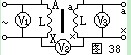 把初级线圈和次级线圈的一对同名端,例如Aa,用导线接起来,如图38所示。然后在AX初级线圈间拉入交流电(比较低的便于测量的)。用电压表分别测 量AX间电压V1值,XX间电压V2值,以及ax间电压V3值。如果V2数值是V1与V3电压之差,则Aa是同极性端,如果V2数值是V1与V3电压之和,则AX是同极性端。