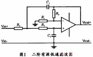 有源滤波器的设计原理图如图1所示,图中采用了一个运算放大器、四个电阻和两个电容来构成有适当阻尼的二阶有源低通滤波器。