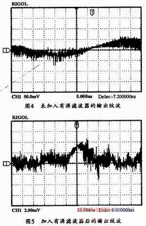 在有输出纹波的波形中,图4给出了未使用有源滤波网络的输出电压纹波图,而图5所示则是使用有源滤波网络后的输出电压纹波图。