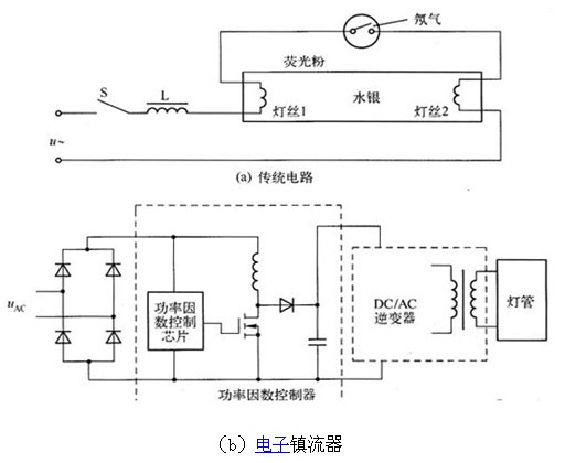 我们知道,最普通的荧光灯的起辉是采用一个串联的铁芯电感和一个并联的起辉器(图3a)。对于这种电路在用LED日光灯直接替换时,只要拔掉起辉器就可以了。但是由于铁芯电感仍然串联在电路中,所以它仍然带来将近6.4W(Philip)到10W(国产)的损耗,结果由于这部分的额外损耗就大大降低了LED的节电功效。