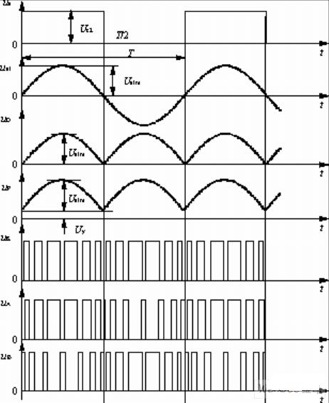 实现SPWM的控制电路框图如图3(a)所示,实际电路各点的波形如图3(b)所示。