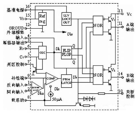 系统采用SG3525来实现SPWM控制信号的输出,该芯片其引脚及内部框图如图2所示。