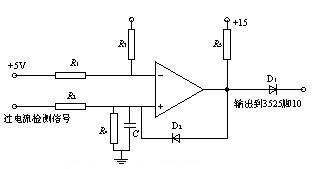 如图1所示,过流?;ば藕湃∽訡T2,经分压、滤波后加至电压比较器的同相输入端,如图4所示。当同相输入端过电流检测信号比反相输入端参考电平高时,比较器输出高电平,使D2从原来的反向偏置状态转变为正向导通,并把同相端电位提升为高电平,使电压比较器一直稳定输出高电平。同时,该过电流信号还送到SG3525的脚10。当SG3525的脚10为高电平时,其脚11及脚14上输出的脉宽调制脉冲就会立即消失而成为零。
