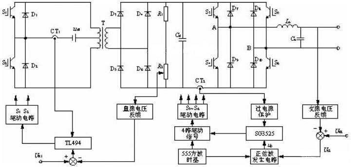 再经过全桥DC/AC逆变电路,得到220V/50Hz交流电压输出。为保证系统可靠运行,防止主电路对控制电路的干扰,采用主、控电路完全隔离的方法,即驱动信号用光耦隔离,反馈信号用变压器隔离,辅助电源用变压器隔离等。