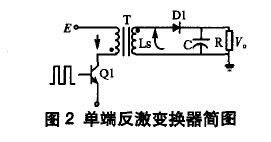 功率转换部分采用单端反激电路,结构如图2。当加到原边主功率开关管Q1的激励脉冲为高电平使Q1导通时,直流输入电压加在原边绕组两端,由于此时副边绕组相位是上负下正,整流管D1反向偏置截止,原边电感储存能量;当激励脉冲为低电平使Q1截止时,原边绕组两端电压极性反向,副边绕组相位变为上正下负,整流管正向偏置导通,变压器储存的能量向副边释放。在此开关过程中,高频变压器既起变压隔离作用,又起电感储能作用。