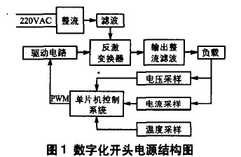笔者设计的数字化开关电源额定功率12OW。系统以开关电源作为基本电路,采用高性能单片机作为控制系统,在控制算法的支持下,通过对输出电压和电流进行实时采样,并与软件给定值相比较,控制和调整开关电源的工作状态,得到期望值。主要包括输入的整流滤波校正、功率变换、辅助电源部分、驱动电路、单片机控制系统5部分。功率变换部分采用单端反激变换电路,辅助电源为驱动电路提供电能,驱动电路将来自单片机的PWM 信号放大后驱动主功率晶体管,单片机系统是整个电路的控制核心,通过采样值的变化实时控制输出PWM 的占空比。整个设计力求做到了性能最优,成本最低。其结构如图1所示。