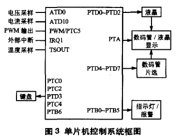 单片机采用Freescale公司的68HC908SR12,其内部资源丰富,集成了12k的程序存储器,2路定时/计数器,14通道1o位A/D转换器,PWM输出,内部温度传感器等。单片机控制系统框图如图3。
