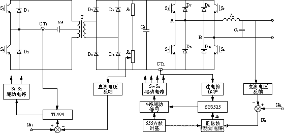 再经过全桥DC/AC逆变电路,得到220V/50Hz交流电压输出。为保证系统可靠运行,防止主电路对控制电路的干扰,采用主、控电路完全隔离的方法,即驱动信号用光耦隔离,反馈信号用变压器隔离,辅助电源用变压器隔离等。