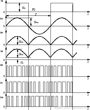 振荡器脚5须外接电容CT,脚6须外接电阻RT。振荡器频率f由外接电阻RT和电容CT决定,f=1.18/RTCT。逆变桥开关频率定为10kHz,取CT=0.22μF,RT=5kΩ。振荡器的输出分为两路,一路以时钟脉冲形式送至双稳态触发器及两个或非门;另一路以锯齿波形式送至比较器的同相输入端,比较器的反向输入端接误差放大器的输出。误差放大器的输出与锯齿波电压在比较器中进行比较,输出一个随误差放大器输出电压高低而改变宽度的方波脉冲,再将此方波脉冲送到或非门的一个输入端?;蚍敲诺牧砹礁鍪淙攵朔直鹞忍シ⑵骱驼竦雌骶獬莶?。双稳态触发器的两个输出互补,交替输出高低电平,将PWM脉冲送至三极管V1及V2的基极,锯齿波的作用是加入死区时间,保证V1及V2不同时导通。最后,V1及V2分别输出相位相差180°的PWM波。