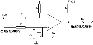 过电流?;げ捎玫缌骰ジ衅髯魑缌骷觳庠渚哂凶愎豢斓南煊λ俣?,能够在IGBT允许的过流时间内将其关断,起到?;ぷ饔?。如图1所示,过流?;ば藕湃∽訡T2,经分压、滤波后加至电压比较器的同相输入端,如图4所示。当同相输入端过电流检测信号比反相输入端参考电平高时,比较器输出高电平,使D2从原来的反向偏置状态转变为正向导通,并把同相端电位提升为高电平,使电压比较器一直稳定输出高电平。同时,该过电流信号还送到SG3525的脚10。当SG3525的脚10为高电平时,其脚11及脚14上输出的脉宽调制脉冲就会立即消失而成为零。