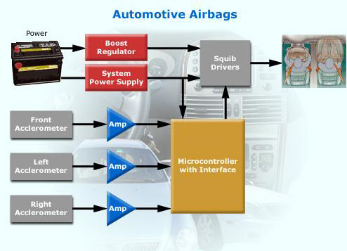 即使是小型的汽车目前都设有6个气囊,而且所采用的安全标准要求极高。负责为气囊充气的是一款称为爆管驱动器(squib driver)的特别芯片,该芯片必须能够在撞车的紧急关头立即启动。按照图1所示,气囊系统由多个部分组成。