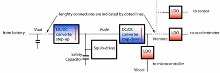 以下简单介绍气囊系统的充气过程。气囊系统设有升压转换器,一般来说,这些升压转换器都采用 sepic拓扑(sepic拓扑要求电路中采用两个电感) 或回扫拓扑结构(回扫拓扑中需要采用一个变压器)。进行充气之前,气囊系统的升压转换器会先将电池电压(Vbat)提高(这个电池电压在负载突降时可高达 40伏),直至达到安全电压(Vsafe)要求的电平,这样可确保安全电容器储存大量电能(见图2)。之后才将这个较高的安全电压调低至几伏,这个较低的电压称为远程电压(Vremote)。必须严格按照这个充气准备程序,以确保其后几级的低压降稳压器出现较少压降。压降越少,功耗也就越低,效率也就越高。