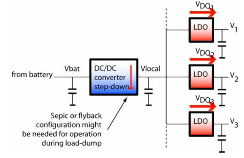 我们若采用开关稳压器作为输入级,再以多个低压降稳压器提供输出,便可降低电源系统的整体成本。高功率的电源系统甚至必须采用这样的设计。图4是其中一个示例。