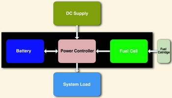 上述系统在使用的不同阶段,能够用做三种能源和两种负载。当该系统没有插接直流电源时,燃料电池和/或蓄电池的组合结构能够为系统负载供电。另外,当直流电源不存在时,燃料电池还能够对蓄电池进行充电,以尽可能地增强电源断电末期(end-of-power-shutdown)的性能,或者实现更好的系统动态电源响应特性。当直流电源可用时,它既对蓄电池进行充电也对系统负载进行供电。