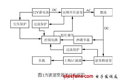 本逆变电源输入端为蓄电池(+12V,容量90A·h),输出端为工频方波电压(50Hz,310V)。其结构框图如图1所示。