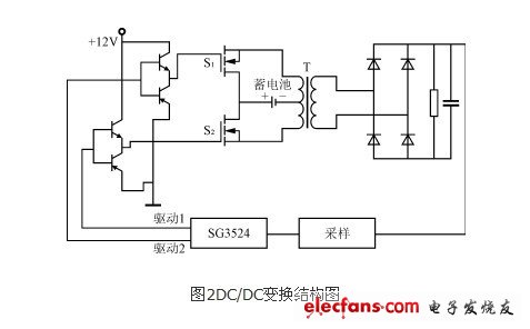 由于变压器原边电压比较低,为了提高变压器的利用率,降低成本,DC/DC变换如图2所示,采用推挽式电路,原边中心抽头接蓄电池,两端用开关管控制,交替工作,可以提高转换效率。而推挽式电路用的开关器件少,双端工作的变压器的体积比较小,可提高占空比,增大输出功率。