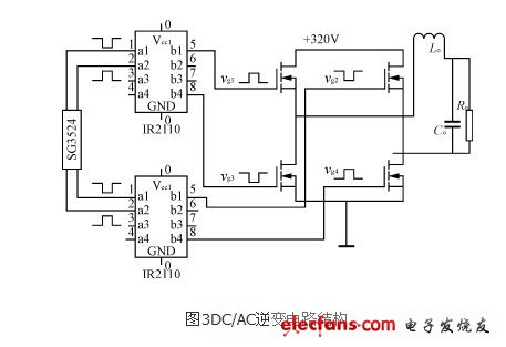 如图3所示,DC/AC变换采用单相输出,全桥逆变形式,为减小逆变电源的体积,降低成本,输出使用工频LC滤波。由4个IRF740构成桥式逆变电路,IRF740最高耐压400V,电流10A,功耗125W,利用半桥驱动器IR2110提供驱动信号,其输入波形由SG3524提供,同理可调节该 SG3524的输出驱动波形的D<50%,保证逆变的驱动方波有共同的死区时间。