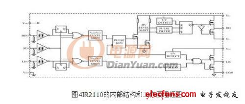 IR2110 的内部结构和工作原理框图如图4所示。图中HIN和LIN为逆变桥中同一桥臂上下两个功率MOS的驱动脉冲信号输入端。SD为?;ば藕攀淙攵?,当该脚接高电平时,IR2110的输出信号全被封锁,其对应的输出端恒为低电平;而当该脚接低电平时,IR2110的输出信号跟随HIN和LIN而变化,在实际电路里,该端接用户的?;さ缏返氖涑觥O和LO是两路驱动信号输出端,驱动同一桥臂的 MOSFET。