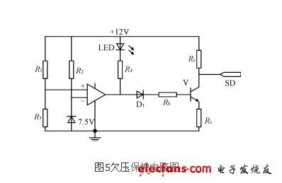 图5中运算放大器的正向输入端的电压由R1和R3分压得到,而反向输入端的电压由稳压管箝位在+7.5V,当蓄电池的电压下降超过预定值后,运算放大器开始工作,输出跳转为负,LED灯亮,同时三级管V截止,向SG3524的SD端输出高电平,封锁IR2110的输出驱动信号。