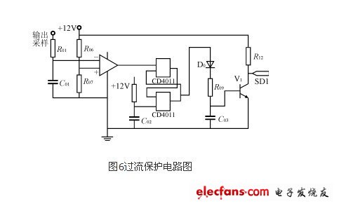 过流?;さ缏啡缤?所示,它监测输出电流状况,预设为1.5A。方波逆变器的输出电流经过采样进入运算放大器的反向输入端,当输出电流大于1.5A后,运算放大器的输出端跳转为负,经过 CD4011组成的R-S触发器后,使三级管V1基级的信号为低电平,三级管截止,向IR2011的SD1端输出高电平,达到?;さ哪康摹?/p>