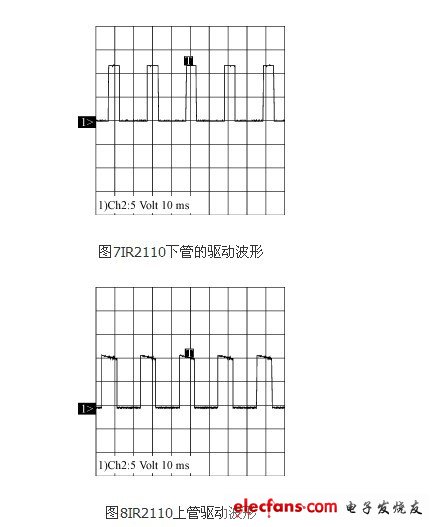 调试过程遇到的一个较为重要的问题是关于IR2110的自举电容的选择。IR2110的上管驱动是采用外部自举电容上电,这就使得驱动电源的路数大大减少,但同时也对VB和VC之间的自举电容的选择也有一定的要求。经过试验后,最终采用1μF的电解电容,可以有效地满足自举电压的要求。
