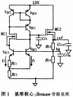 目前的基准核心可以有多种实现方案:混合电阻,Buck voltage transfer cell,但是修调复杂,不宜工业化。本设计采用Brokaw基准核心,其较易实现高压基准输出,并且其温漂、PSR及启动特性均较好。本文采用的改进的Brokaw基准核心的结构如图1所示。