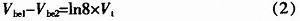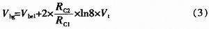 其中I是三极管射极电流,Is与射极面积成正比,n为一常数,取1。这里,取VQC2:VQC1=8:1,因此Is2=8xIs1,又I1=I2,分别代入(1)并相除,整理得: