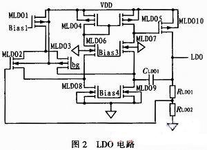 LDO在低频时的PSR主要取决于运放的增益,为此选择折叠共源共栅电路。此LDO电路基于文献中的电路修改,如图2所示,并采用PSR高的偏置生成电路。