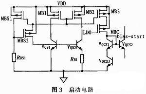这样虽然能启动,但是,正常工作时,此大启动电流bias-start将通过VQCS1和VQCS3流向地,增加了系统的负担。因此,在电流输出管MB3下加入控制管MBC,并使得在正常工作时,LDO的高电压足以使MBC关断,从而降低启动电路的损耗。