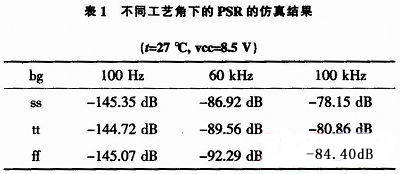 表1为输出电压bg在不同工艺角下的PSR的仿真结果,本电路在不同工艺角下都能在高电源干扰的芯片中正常工作。