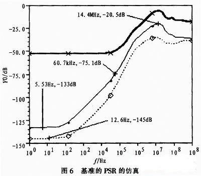 电子镇流器的供电方式为半桥输出接稳压管给芯片供电,其输出电压为高压正弦波(50~100 kHz),加之芯片内数字部分的干扰,这就给芯片的电源带来较大的干扰。因此对芯片内基准的中频PSR(Power Supply Rejection,电源抑制)有较大要求。本文从此角度在Brokaw带隙基准的基础上进行改进,采用LDO与基准的级联设计来增加其PSR。