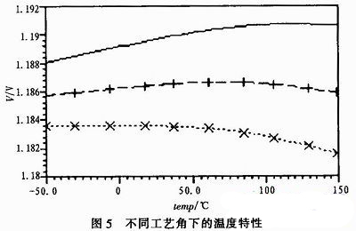 图5为不同工艺角下的温漂仿真。仿真结果表明,此电路可以达到ref-45 ppm、bg-7.5 ppm的低温漂。实际电路存在器件的不匹配和误差等,虽然达不到理论上的温漂,但通过仔细布版、修调带隙核心电路中Rc1、Rc2,可以达到较低的温漂。